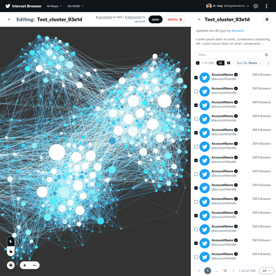 Interest Browser redesign with a focus on accessibility and usability, as well as interaction design that enabled sub-graph management and analytics.